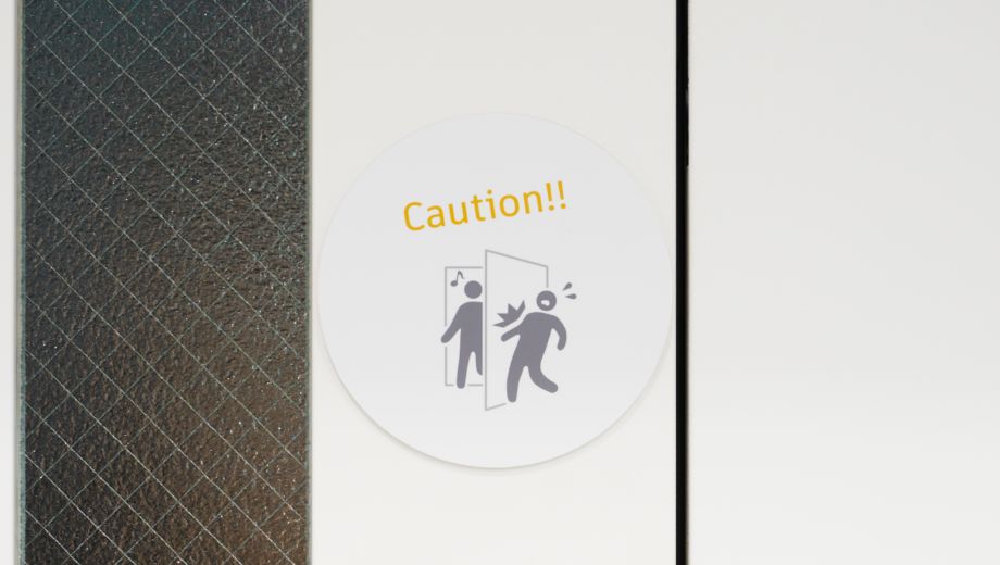 オフィス内の安全対策として、通路の曲がり角や扉付近に注意喚起ピクトグラムを設置し、左側通行を促すサインも各所に掲示しました。
